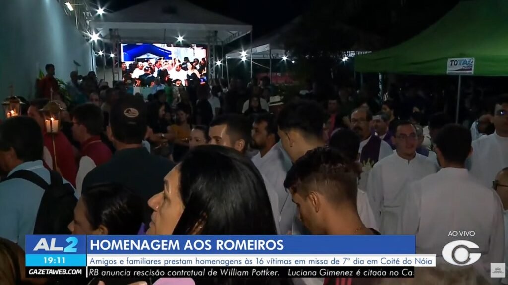 A cidade de Coité do Nóia, no Agreste de Alagoas, viveu na noite desta segunda-feira (9) um momento de forte comoção com a realização da missa de sétimo dia em homenagem aos 16 romeiros que morreram em um acidente de ônibus na semana passada. As vítimas retornavam de Juazeiro do Norte (CE) quando o veículo se envolveu na tragédia.