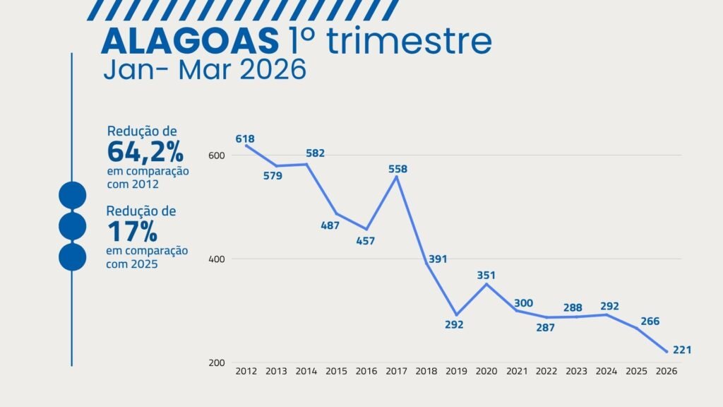Alagoas registrou, no primeiro trimestre de 2026, o menor número de Crimes Violentos Letais Intencionais (CVLI) de toda a série histórica. De acordo com dados do Núcleo de Estatística e Análise Criminal (Neac) da Secretaria de Estado da Segurança Pública (SSP), de janeiro a março deste ano foram notificados 221 casos, ante 618 apresentados em 2012, quando teve início a série. O resultado representa uma queda de 64,23% no período.