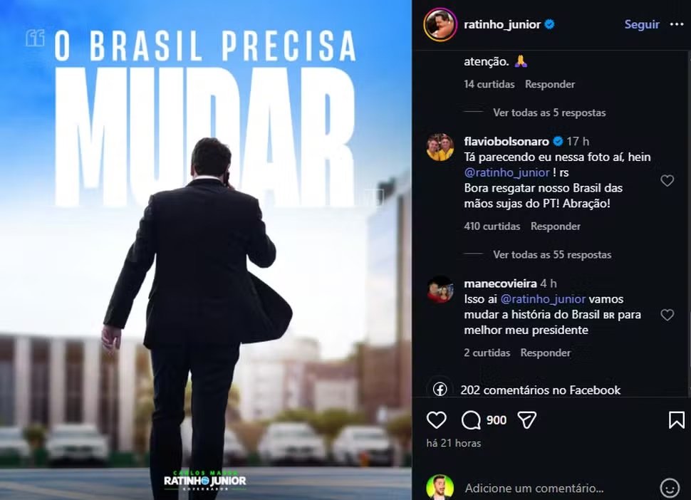 Nesta quinta-feira (12), no que foi visto como um aceno pelo ao entorno de Ratinho Jr., Flávio Bolsonaro comentou em uma publicação do governador no Instagram. “Tá parecendo eu nessa foto aí”, escreveu o senador. “Bora resgatar nosso Brasil das mãos sujas do PT”, continuou Flávio, em uma postagem que Ratinho aparece com os dizeres “o Brasil precisa mudar”.