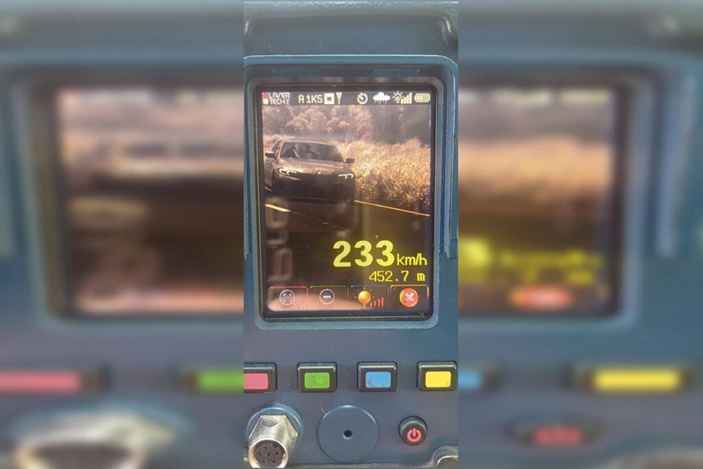 A Polícia Rodoviária Federal (PRF) flagrou uma BMW trafegando pela BR-060 a uma velocidade de 233 km/h. A fiscalização foi realizada com o uso de radar portátil.