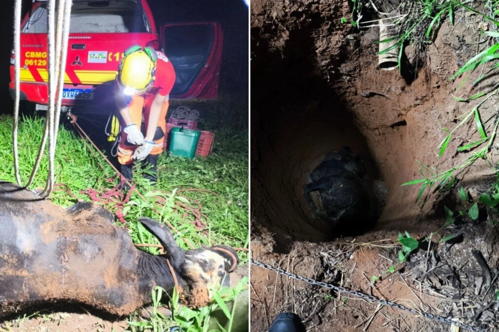 Um bovino foi resgatado pelo Corpo de Bombeiros após cair em uma fossa de cerca de cinco metros de profundidade, no fim da tarde dessa quarta-feira (1º/4), em Córrego Fundo, na região centro-oeste de Minas Gerais.
