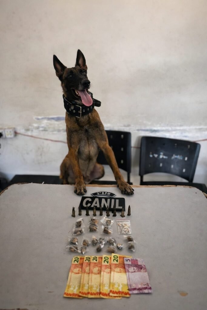 Em seguida, a equipe utilizou o cão policial K9 Bill para realizar uma varredura no terreno baldio de onde o suspeito havia saído. Durante a busca, o animal localizou mais entorpecentes escondidos dentro de uma bolsa feminina coberta por uma sacola plástica preta. Parte do material também estava escondida sob telhas no chão do terreno.