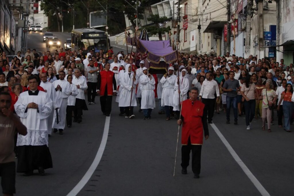 Durante o trajeto, os participantes acompanharam em silêncio, reforçando o caráter solene da celebração. Além disso, a movimentação chamou atenção pela quantidade de pessoas, que ocuparam diferentes pontos da região histórica da cidade.