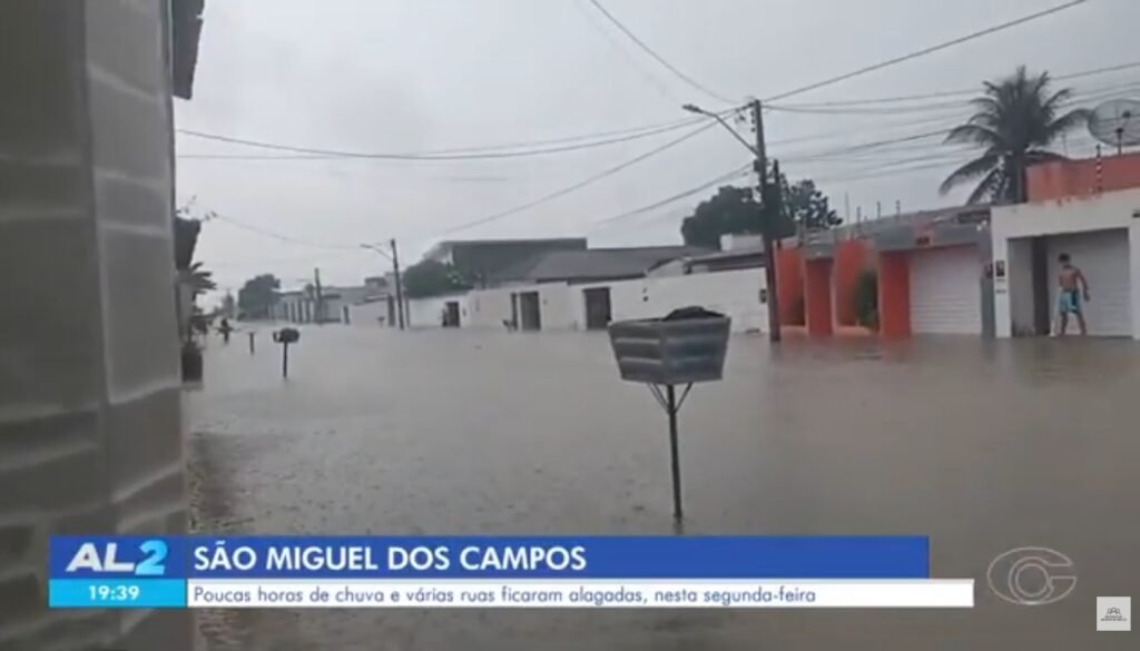 Em São Miguel dos Campos, no sul do estado, a chuva começou no início da tarde desta segunda-feira 2 e provocou alagamentos em várias ruas da cidade.
