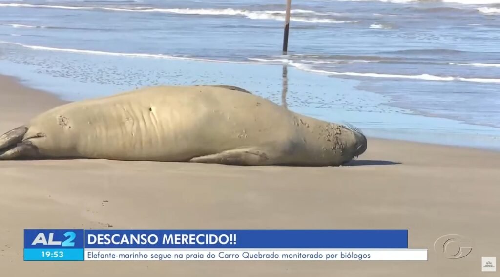 Um elefante-marinho juvenil foi encontrado na praia de Carro Quebrado, na Barra de Santo Antônio, litoral norte de Alagoas. O animal foi localizado por populares na noite de quarta-feira (11). Biólogos suspeitam que o mamífero está descansando para fazer a troca de pele, processo natural da espécie.