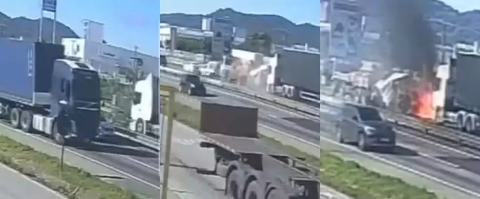Imagens divulgadas nas redes sociais, e com a veracidade confirmada pela Arteris Litoral Sul, flagraram o momento da colisão. É possível ver quando um dos caminhões atinge e prensa os veículos que estavam parados no congestionamento (assista acima).