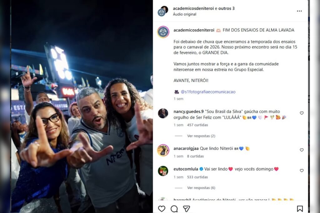 Em vídeos postados nas redes sociais da ministra, Janja e Anielle aparecem ao lado do presidente da escola, Wallace Palhares, fazendo o “L” com os dedos. Anielle utiliza a mesma rede social para divulgar as ações de seu ministério.