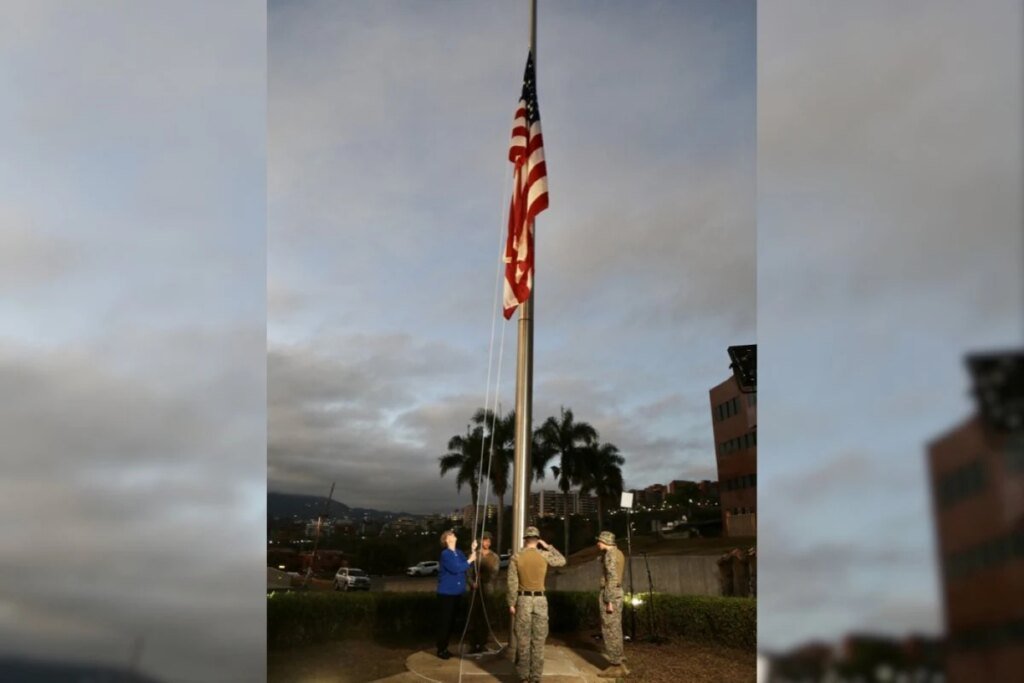 A bandeira havia sido retirada em 14 de março de 2019, durante o primeiro mandato de Donald Trump, quando Washington rompeu relações com o governo venezuelano.