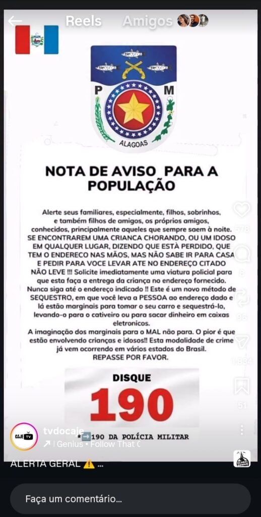Alerta-se que, diante de qualquer necessidade, os canais oficiais para acionamento da Polícia Militar são o 190 (contato para emergência) e o Disque-Denúncia 181. Também é possível abrir o chamado no endereço http://190.seguranca.al.gov.br/.