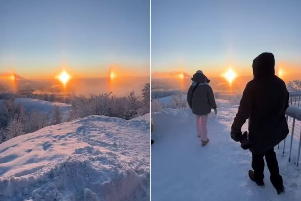 Um vídeo registrado no extremo norte da Rússia chamou a atenção nas redes sociais ao mostrar o que parecem ser “três sóis” surgindo no horizonte. As imagens foram feitas pelo guia turístico Vitaliy Dronyuk, na região de Murmansk, e revelam um fenômeno atmosférico conhecido como parélio.