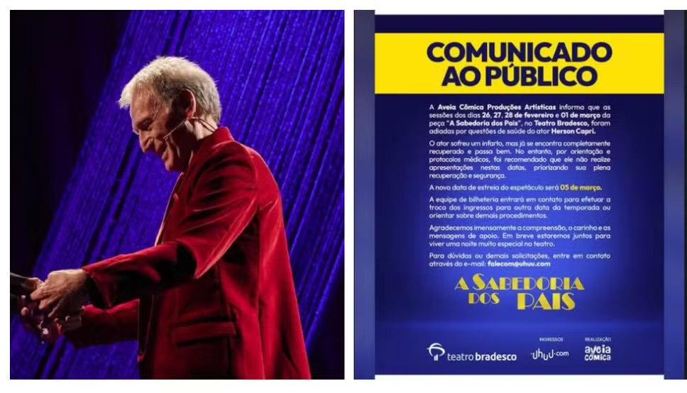 Escrita e dirigida por Miguel Falabella, a peça tem Herson Capri no papel principal ao lado da atriz Natália do Vale. A produção agradeceu as mensagens de apoio enviadas pelos fãs e reforçou que a prioridade, no momento, é a plena recuperação do ator.