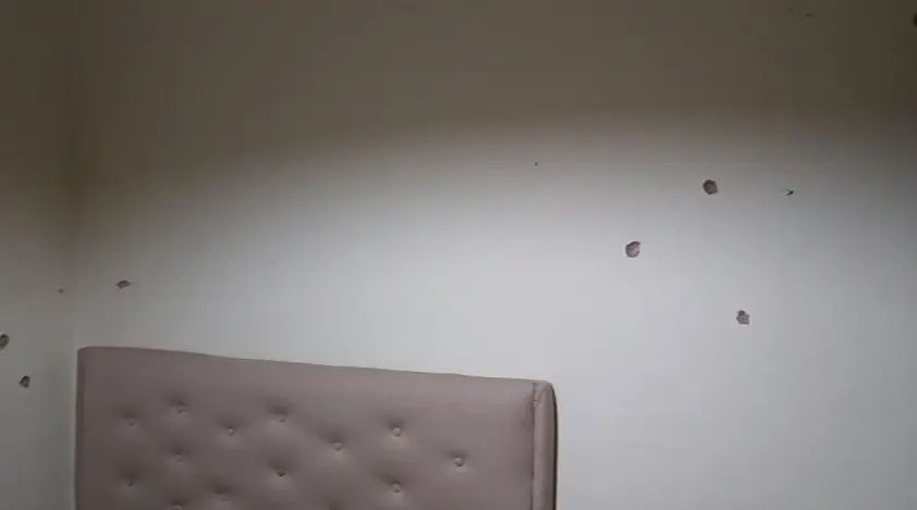 Quarto ficou com marcas de tiros nos móveis, parede e porta