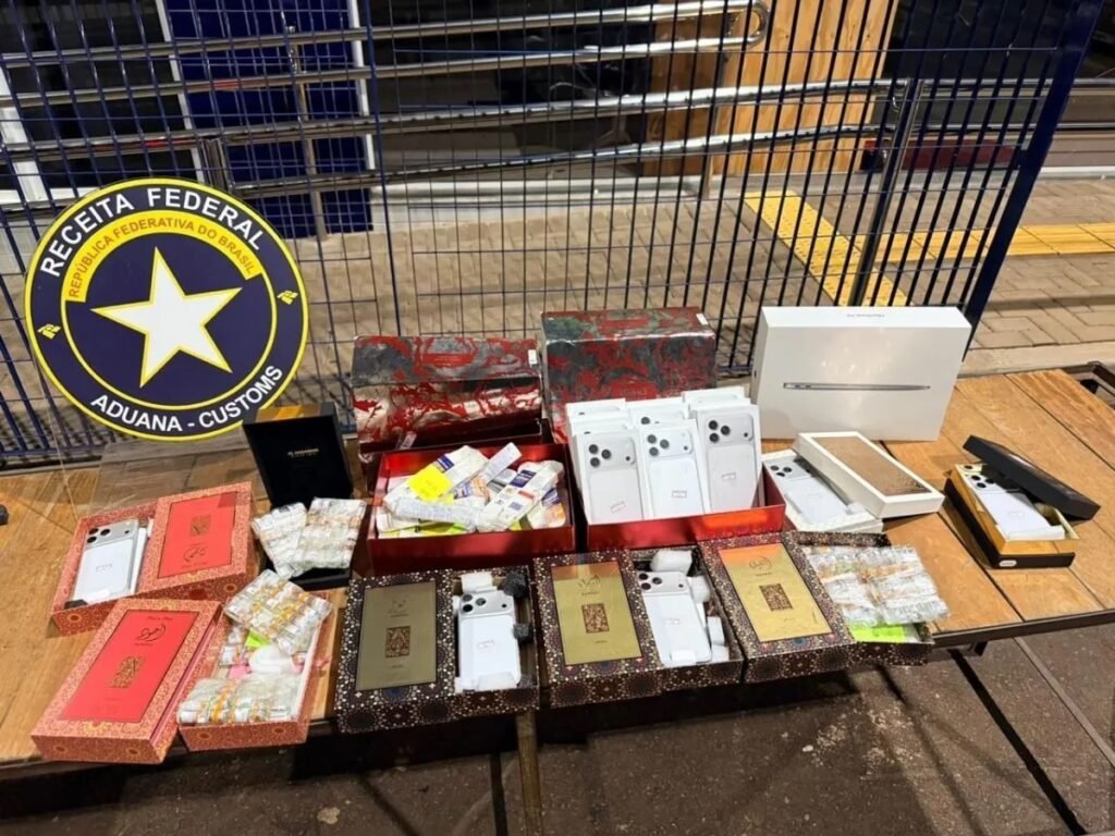 Durante a inspeção, foi localizada, no bagageiro, uma mala com itens pessoais e perfumes. Dentro do compartimento, os agentes encontraram 150 frascos do medicamento tirzepatida, caneta emagrecedora mais conhecida como Mounjaro, 10 iPhones 17 Pro Max e um MacBook Air, todos escondidos nas caixas de perfumes, em mais uma tentativa de burlar a fiscalização.