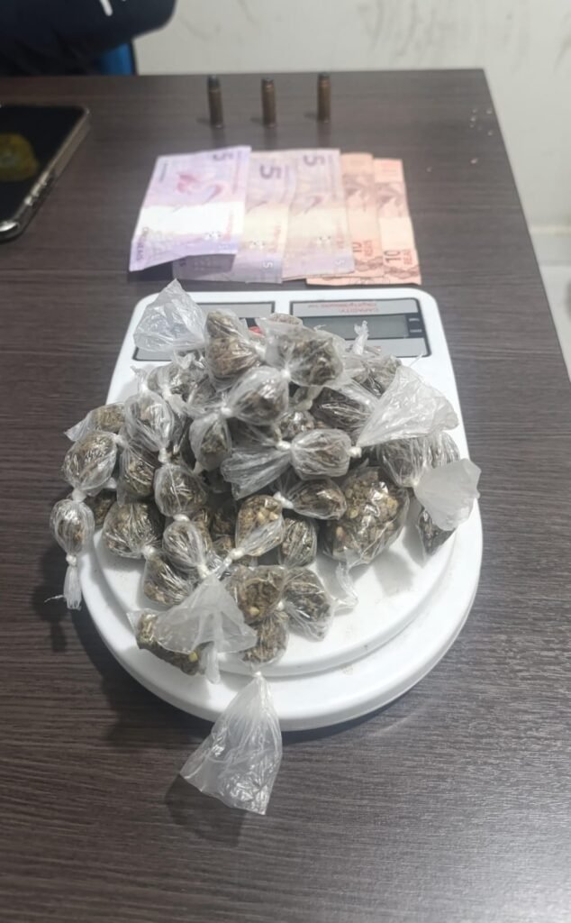 Dentro da sacola, os policiais encontraram uma quantidade de maconha, além de dinheiro trocado e munições de calibre .38. Ao todo, foram apreendidas 72 bombinhas de maconha, pesando aproximadamente 45 gramas, R$ 35,00 em espécie e três munições intactas.