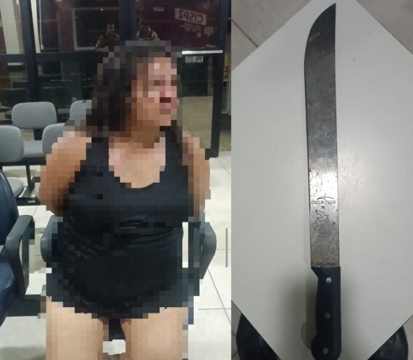 De imediato, foi dada ordem verbal para que a autora soltasse a arma branca, determinação que não foi obedecida. Também foi ordenado que permitisse a saída da vítima, o que igualmente não foi acatado. Em determinado momento, a envolvida colocou o facão entre as pernas para ajeitar o cabelo, ocasião em que o objeto caiu ao solo, sendo aproveitada a oportunidade para intervenção da guarnição. Contudo, a autora retomou rapidamente a posse do facão e tentou desferir um golpe contra um dos policiais.