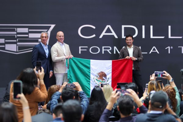 O piloto Sergio Perez, o CEO da TWG Motorsports, Dan Towriss, e Carlos Slim Domit durante uma coletiva de imprensa para firmar sua parceria com a Cadillac