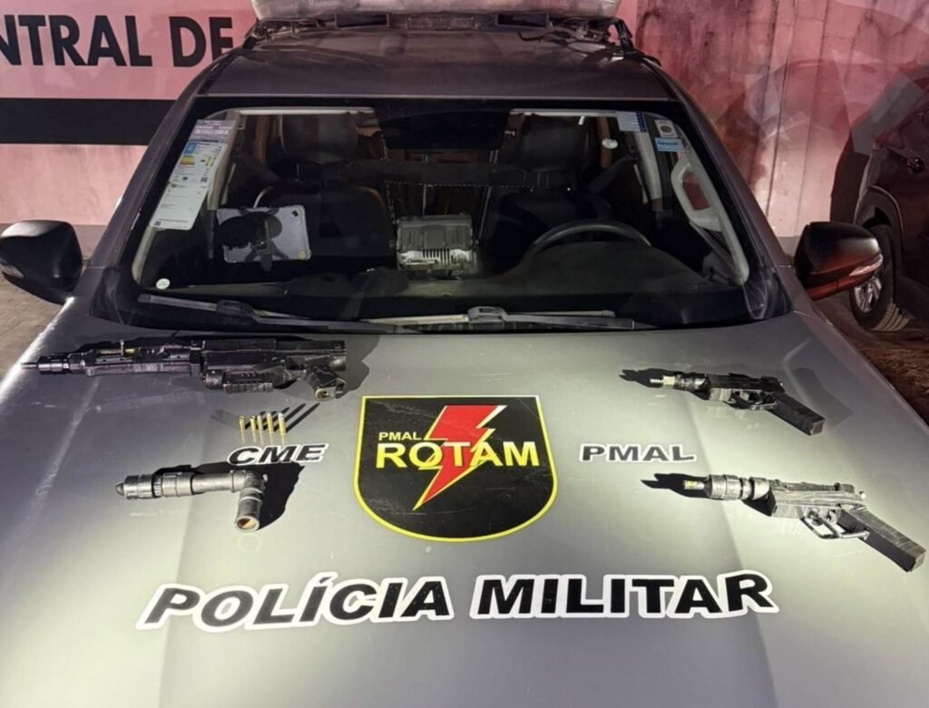 No bairro do Benedito Bentes II, uma guarnição do Batalhão de Rotam realizou uma incursão após um trabalho de inteligência que indicava indivíduos armados na região. Durante a varredura no perímetro onde os suspeitos estavam, os militares localizaram uma bolsa contendo quatro armas de fogo artesanais e munições de calibres 38 e 32. Todo o material ilícito apreendido foi entregue à Polícia Civil para os procedimentos de investigação.