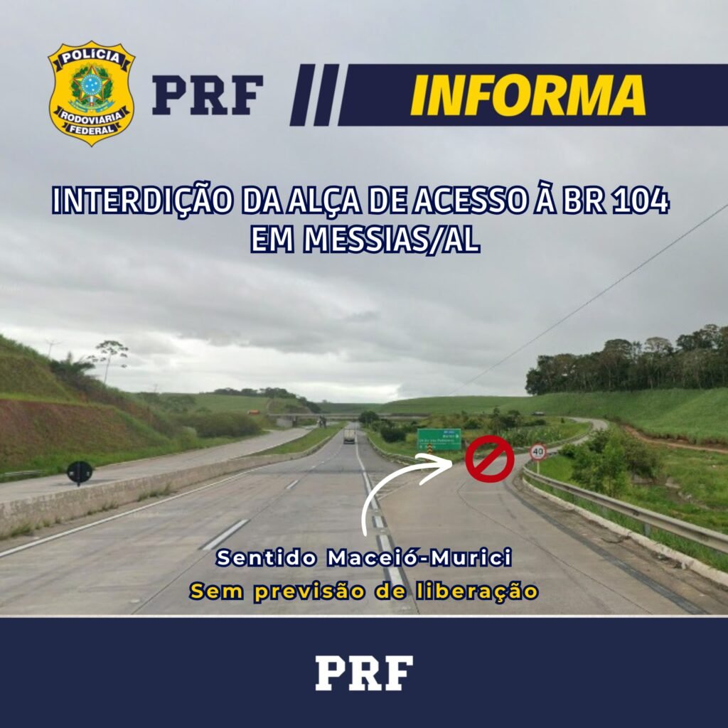 A Polícia Rodoviária Federal (PRF) confirmou no final da manhã desta segunda-feira (9), a interdição da alça de acesso à BR-104, no município de Messias, no sentido Maceió–Murici. Até o momento, não há previsão de liberação.