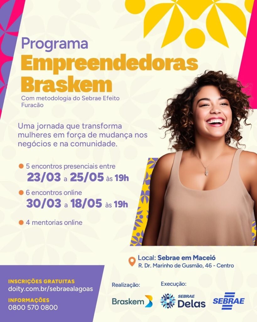 O fortalecimento do empreendedorismo feminino ganha ainda mais destaque no mês dedicado às mulheres. Com esse propósito, o programa Empreendedoras Braskem chega a Maceió para capacitar, orientar e impulsionar negócios liderados por mulheres. A iniciativa é gratuita, está com inscrições abertas e conta com a parceria do Sebrae, responsável por conduzir a formação e o acompanhamento das participantes.