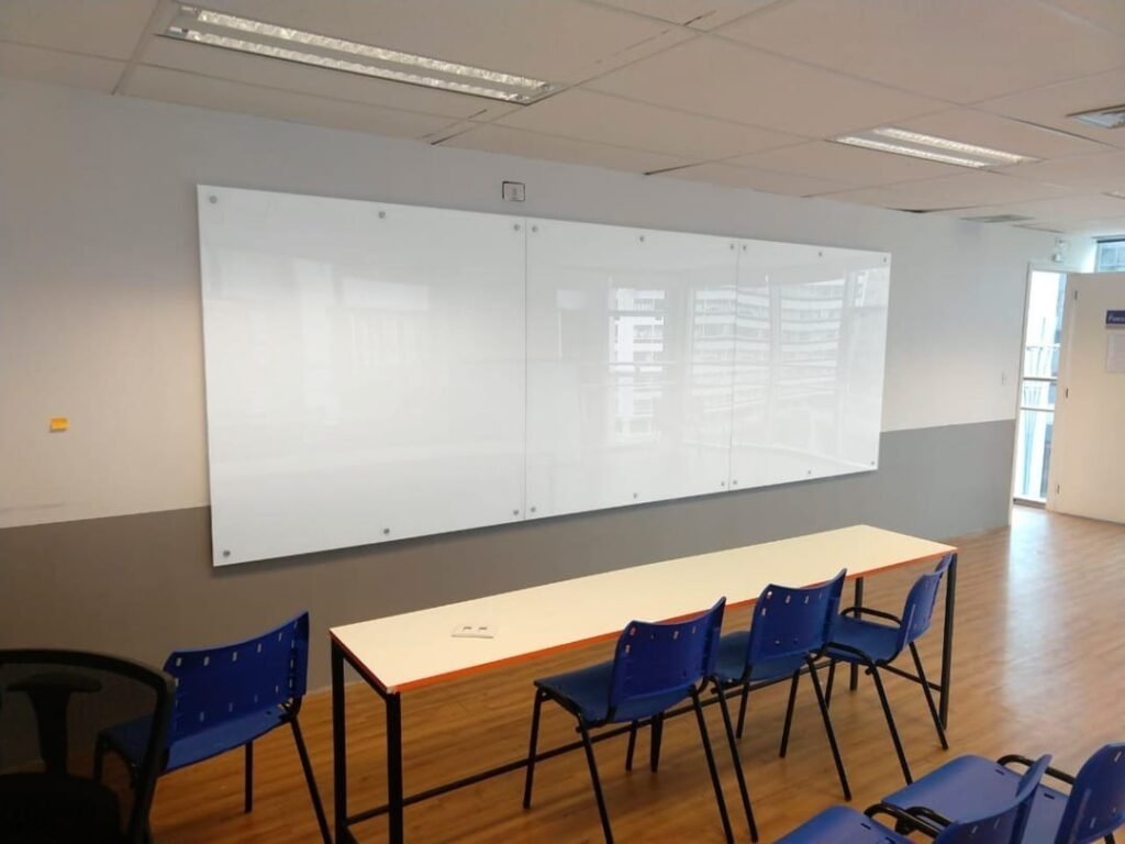 Além de altamente funcional, a lousa de vidro oferece uma estética moderna que pode ser adaptada com cores e elementos visuais, como planilhas e marcas d’água, promovendo a identidade visual da instituição.