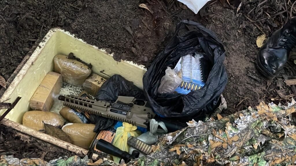 No local, os militares localizaram uma espingarda calibre 12, uma carabina calibre 9mm com luneta telescópica, dois carregadores alongados calibre 9mm, 124 munições de diversos calibres, seis aparelhos celulares, um traje de camuflagem, além de aproximadamente 1,6 kg de cocaína, 5,5 kg de maconha e 2,2 kg de crack, com insumos para acondicionamento das drogas. Todo o material foi encaminhado à DRACCO para os procedimentos legais cabíveis.
