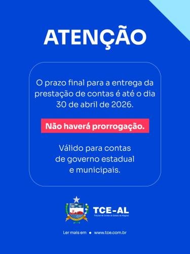 O Tribunal de Contas do Estado de Alagoas reforça o alerta para o prazo de envio das prestações de contas de governo estadual e municipais. O envio deve ser realizado impreterivelmente até o dia 30 de abril, sem possibilidade de prorrogação.