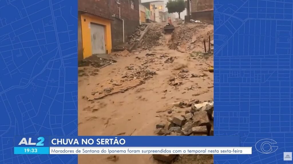 Um temporal atingiu Santana do Ipanema, no Sertão de Alagoas, na tarde desta sexta-feira (13), provocando alagamentos, correntes de água nas ruas e transtornos para moradores e motoristas. Imagens enviadas pela população mostram a força da chuva, que caiu com intensidade e surpreendeu quem estava na cidade.
