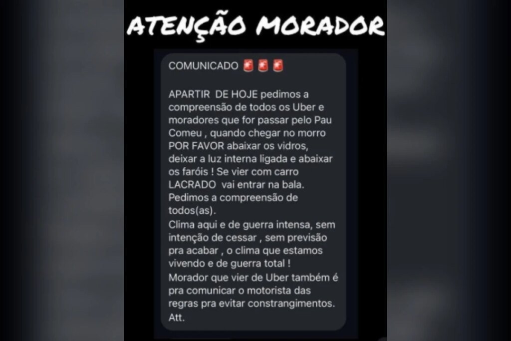A mensagem é direta ao público: condutores de Uber devem trafegar com os vidros abaixados, luz interna acesa e faróis baixos ao acessar o local. O descumprimento das ordens, segundo o texto, poderia colocar motoristas em risco. “Vai entrar na bala”, diz o texto.