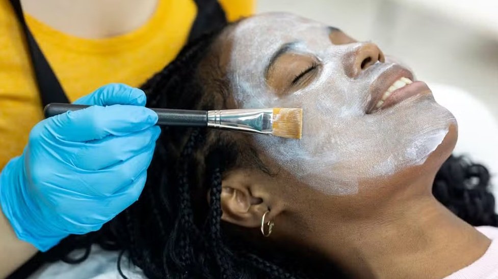 Mulher recebe aplicação de máscara facial. — Foto: Getty Images via BBC