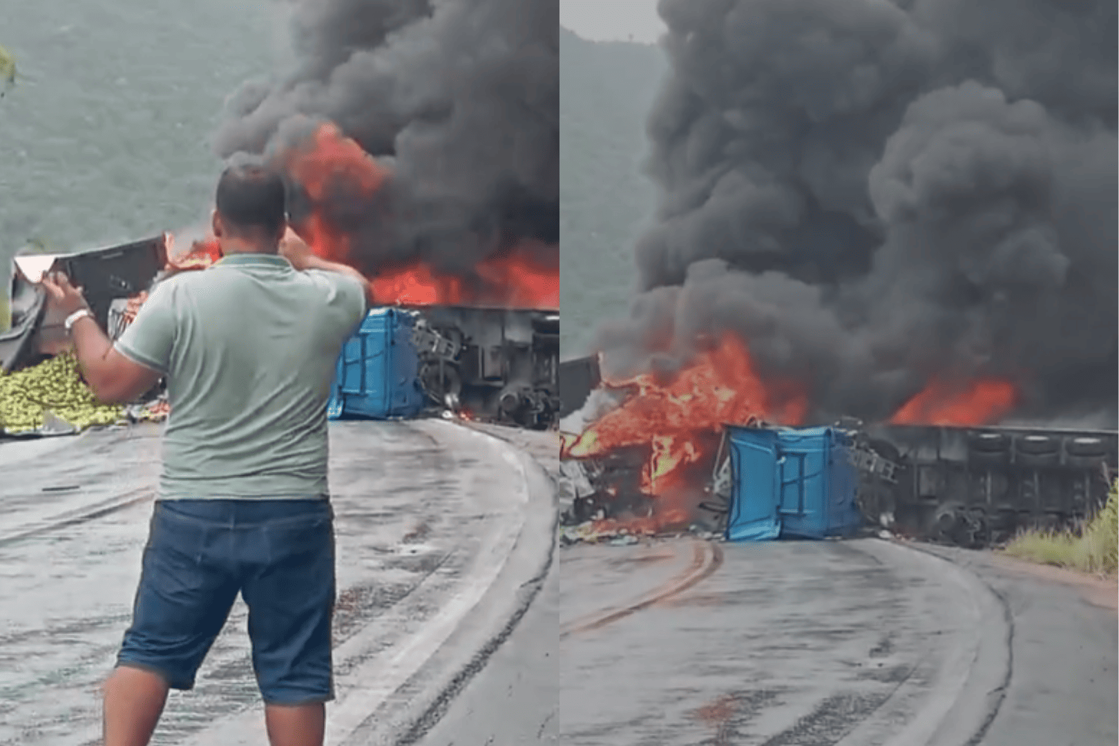 Imagens que circulam nas redes sociais mostram o veículo tombado às margens da pista, já em chamas, enquanto pessoas se aproximam do local.