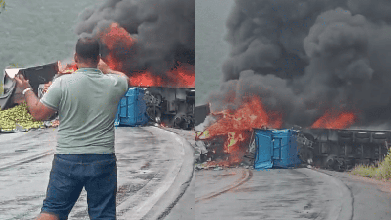 Imagens que circulam nas redes sociais mostram o veículo tombado às margens da pista, já em chamas, enquanto pessoas se aproximam do local.