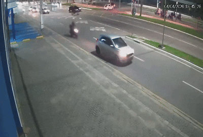 Nas imagens, é possível ver o momento em que um carro dá ré e o motociclista bate na traseira do veículo.