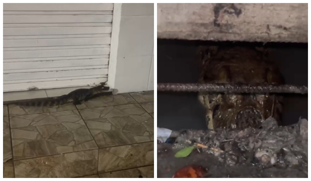 Ao menos três jacarés foram flagrados circulando livremente pelas ruas e canais de esgoto da cidade de Jequiá da Praia, no Litoral Sul de Alagoas, nesse domingo (12).