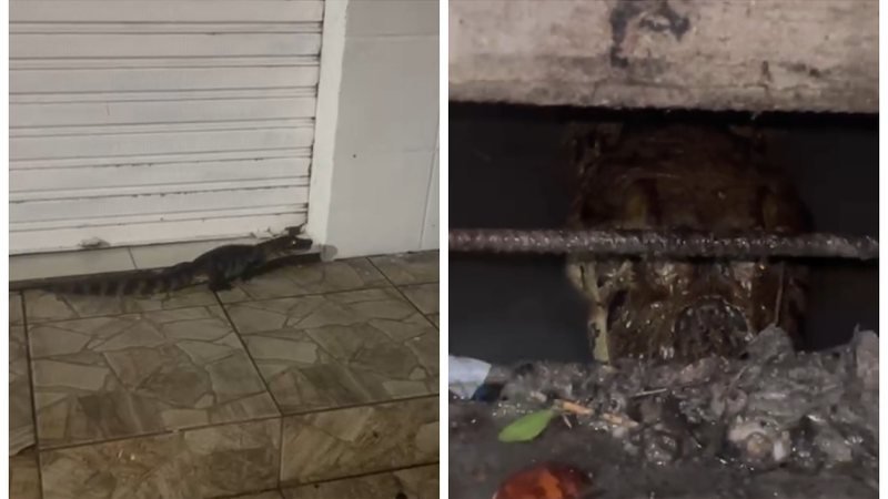 Ao menos três jacarés foram flagrados circulando livremente pelas ruas e canais de esgoto da cidade de Jequiá da Praia, no Litoral Sul de Alagoas, nesse domingo (12).