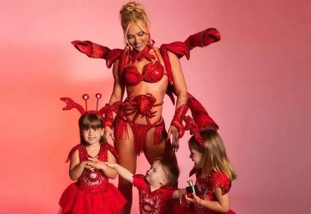 Para participarem da folia, a famosa fez questão de fantasiá-los com a mesma fantasia que a dela, de caranguejo.